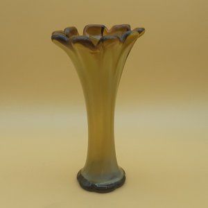 A brown carnival glass vase with a petal style mouth, my best guess is that its from the 1950s. The glass is smoky and there is wear, especially on the bottom. The vase stands 11 1/4" tall and is 6" wide.