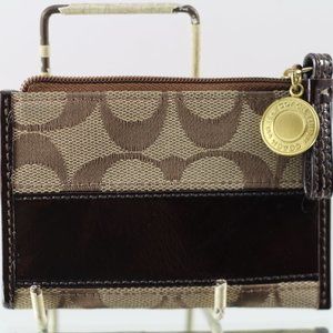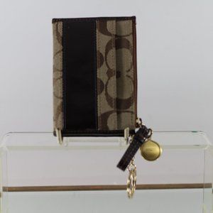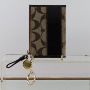 Coach Brown change/card purse w/key ring attachment. Gold tone hardware. Brown leather trimming. Lined with pretty striped fabric. In great condition - its a great travel wallet. Thanks for the peek! #PoshmarkCanada