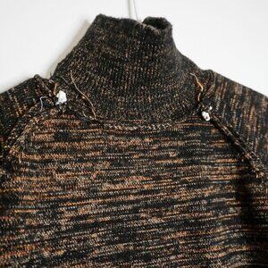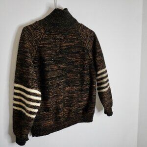 This cozy marled knit sweater features a warm blend of dark brown, black, and rust tones, giving it a rich, earthy texture. The high-neck collar provides extra comfort and warmth, perfect for chilly weather. Adding a sporty edge, the sleeves are accented with bold cream-colored stripes, creating a striking contrast against the marled background. With a relaxed fit and casual vibe, this sweater is ideal for layering or wearing on its own for an effortlessly cool, laid-back look. Pair it with jeans or joggers for a casual weekend outfit.