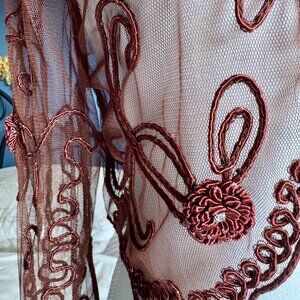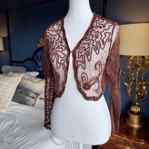 Brown mesh with embroidered pattern bolero, no size but fits like a M/L. Flower appliqué accents with rhinestones. Long bell sleeves, hook clasp at bust. Great used condition. Bust measures 17 inches laying flat, length from shoulder to hem is 15.5 inches. Small tear in fabric as shown in photo 7. Cat friendly, nonsmoking home.