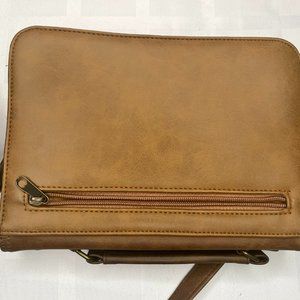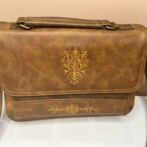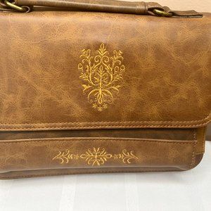 Charming vintage faux leather bag in warm brown tones, featuring elegant machine embroidery on the flap.