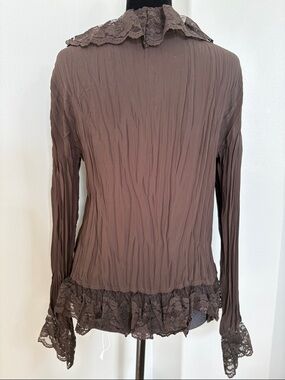 Soft brown blouse with cascading lace ruffles down the front and at the hem. Lightweight, textured fabric offers a flattering drape. Delicate lace trim at the collar and cuffs adds feminine detail. Versatile piece that pairs well with trousers or skirts for polished looks.