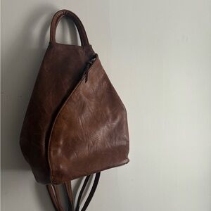 Stylish brown faux leather backpack. Features a unique design with adjustable straps. Never used. Purchased in Italy.