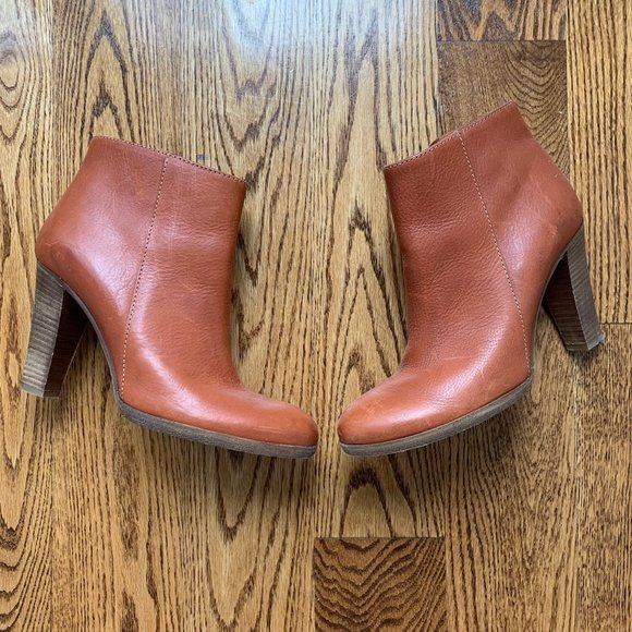 Brown leather boots in good condition, very lightly worn at soles. About a 4 inch heel.