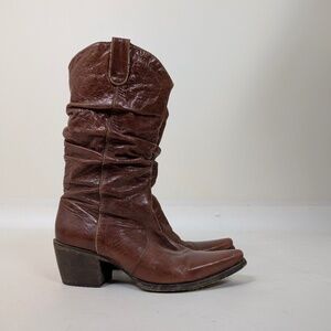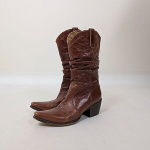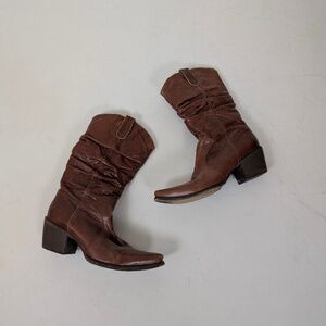 Brown Leather Cowgirl Cowboy Boots Mesh Lining Heeled Slouchy