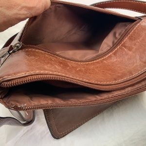 This bag is in excellent, clean condition, with just some wear on the bottom corners, and on the edges of the shoulder strap. It has two outside pockets: one which closes with a snap and the other a zip. The larger snap-close one has places for credit cards and ID, as well as a small cellphone pocket. There are also two pockets on the inside: one zippered and one larger cellphone pocket. The strap is fully adjustable, so this can be a crossbody or a shoulder bag.