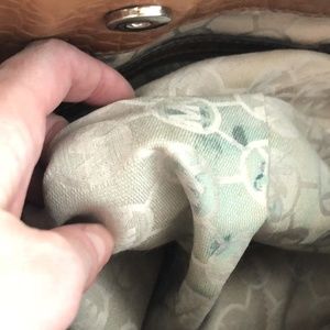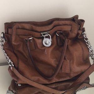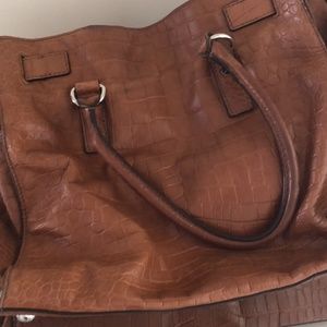 Large size Michael Kors bag. Brown leather with alligator skin texture. In good condition aside from some minor blue stains on inside pocket.