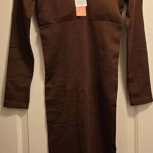 Elegant chocolate brown long sleeve midi dress with a flattering fitted silhouette. Features a soft ribbed bodice, scoop neckline, and a gently structured empire waist that creates a slimming, elongated look. Comfortable stretch fabric makes it easy to wear all day or night.