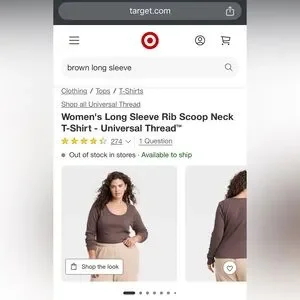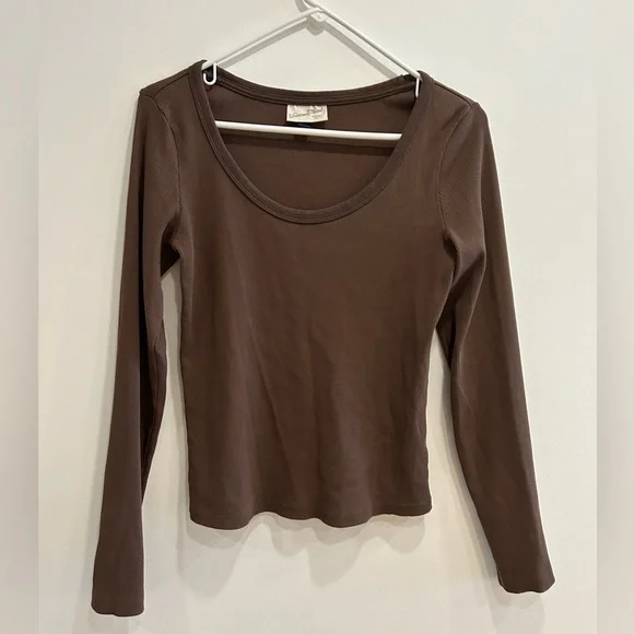 This ribbed scoop neck brown long sleeve is very soft and comfortable. It has only been worn a handful of times. There are no stains or tears. It was purchased from Target in the United States, so the sizing is a little bigger than a Canadian size M.