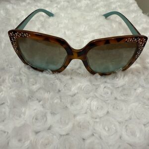 These oversized square sunglasses feature a luxurious brown tortoiseshell frame adorned with elegant metallic studs on the upper corners. The gradient blue-green lenses add a touch of sophistication, making them a perfect accessory for a high-fashion look.