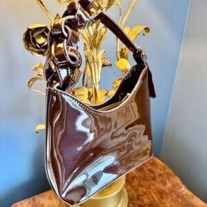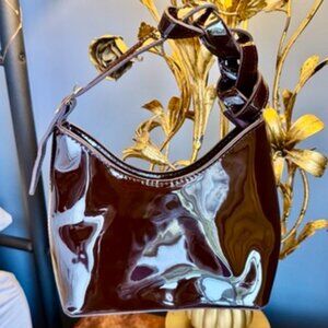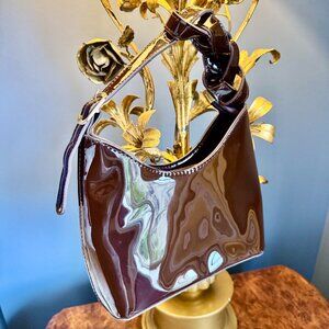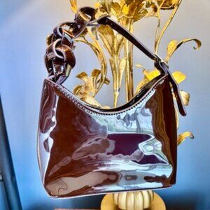 Brown patent bag with braided strap. No tags, purchased second hand so I have no info but the previous owner braided the strap and its so pretty like this I haven't undone it as I suspect it would be a normal adjustable crossbody/shoulder bag without the braiding. Has a few very small scratches that I couldn't really get to show in photos as they are so hard to see, and one scuff mark as shown in photo 12. Gold hardware, zippered main closure with black fabric lining and one small zippered compartment inside. Measures 8.5 inches long, 5 inches tall at center of purse, 7 at outer sides, 2.5 inches wide, strap drop is about 5.25 inches. Cat friendly, nonsmoking home.