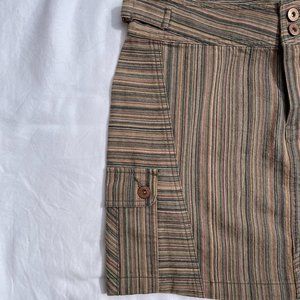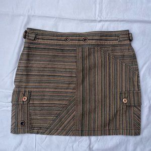 Brown striped denim mini skirt by “Industry”. Reminds me of Jaded London’s BOWEDY STRIPE CORD skirt. Perfect for fall! Neutral coloured stripes, copper metal detailing, cargo pockets, adjustable buckle waist. NEW condition without tags, size small.