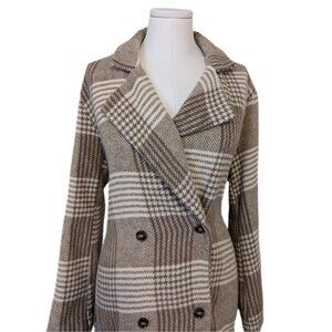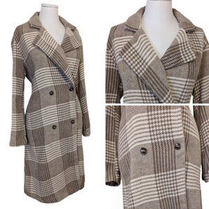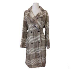 Brown Plaid Double Breasted Trench Coat Jacket Neutral Chic Houndstooth Size L