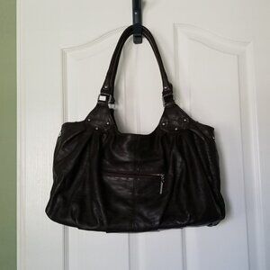 Brown purse with flower design. Large size. Tan inside. Discounted for some marks on seam of shoulder strap (see last photo).