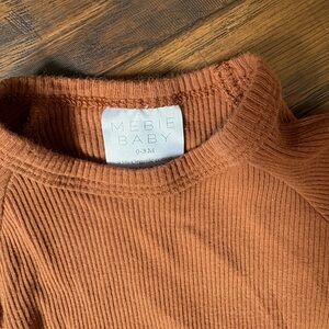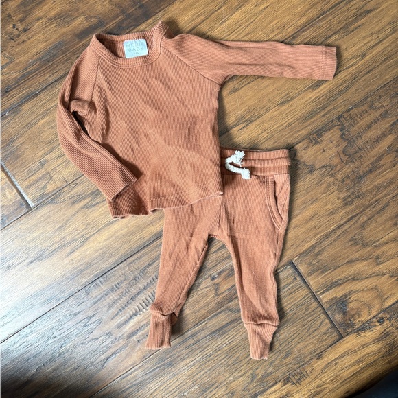 Cozy rust ribbed baby top and pants set. Perfect for comfort and style.