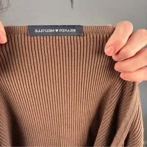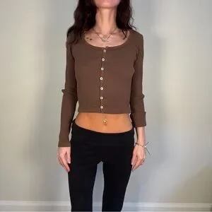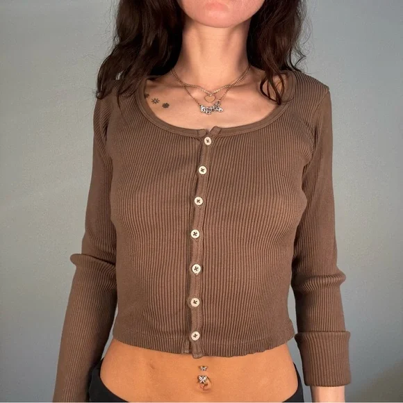 Elevate your style with this chic brown ribbed button-up top. Perfect for any occasion, this top offers both comfort and elegance.