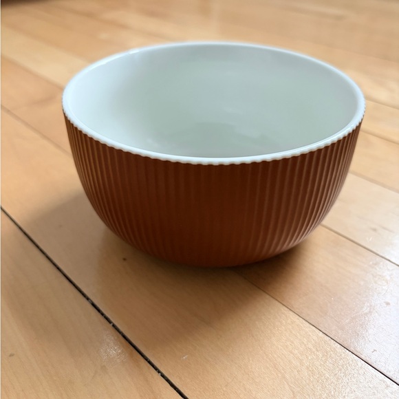 Elegant brown ribbed ceramic bowl with a white interior. Perfect for serving or decor. Excellent condition