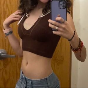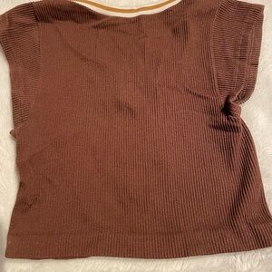 Stylish brown ribbed crop top. Features a scoop neckline. Perfect for casual wear or parties
