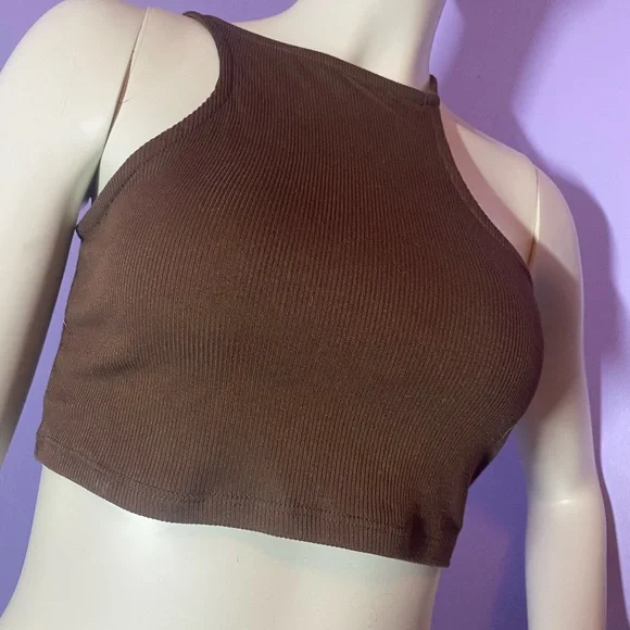 brown asymmetrical, ribbed crop top. Perfect for casual wear.