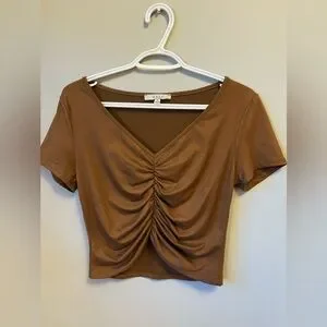 Elevate your style with this chic brown ruched V-neck top. Perfect for any occasion, this top offers a flattering fit and a touch of elegance.