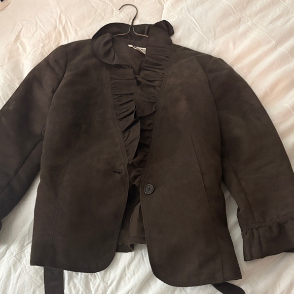 Elegant brown jacket with ruffled details, perfect for adding a touch of sophistication to any outfit.