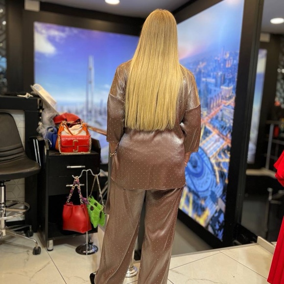 Elegant brown satin two-piece set with subtle shimmer. Perfect for a chic look.