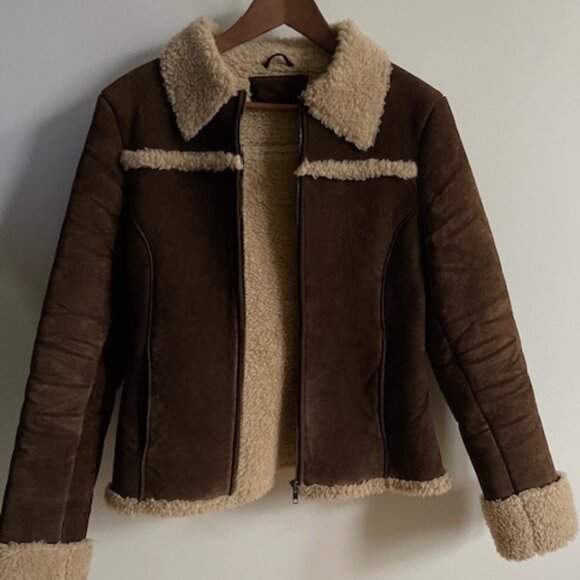 Brown shearling-style jacket with soft, fuzzy interior and a structured fit.