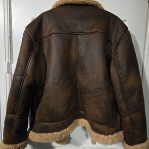 Stay warm and stylish with this brown shearling jacket. Perfect for any occasion.