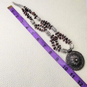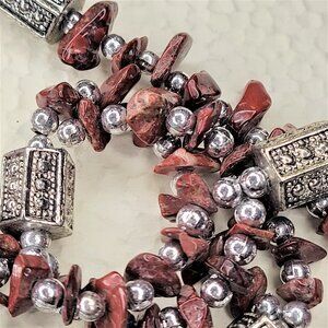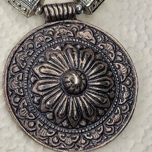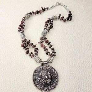 Brown Shell and Tubular Silver Tone Bead Necklace with Large Round Pendant