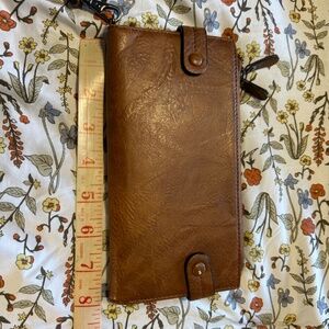 Beautiful brown wristlet, snap closure on the sides. 13 card slots + drivers license. 3 internal long slots. Each outside flap contains a zippered pockets, pretty light brown design on the inside. Small area of damage on one snap as shown in pictures.