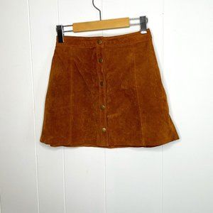 A faux suede mini skirt featuring a button-down front and an A-line silhouette.