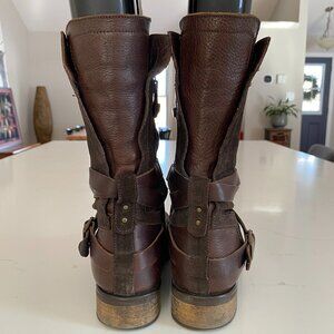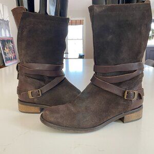 Step up your style with these sleek brown suede booties! Featuring a chic buckle detail and flat heel, they’re perfect for dressing up or down. Size: 8 | Good condition