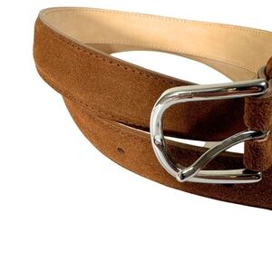 Elevate your everyday look with this premium suede leather belt by Allen St., expertly crafted in France. Rich brown cowhide suede (cuir de vachette) meets sleek silver-tone hardware in a timeless design that blends classic quality with modern edge. This high-end belt is a true wardrobe staple for those who appreciate refined accessories.