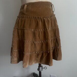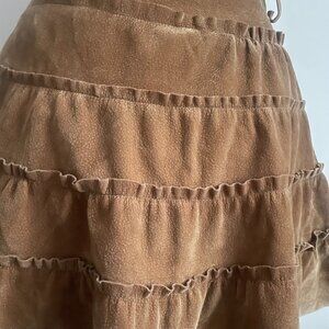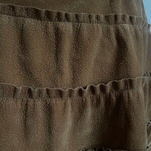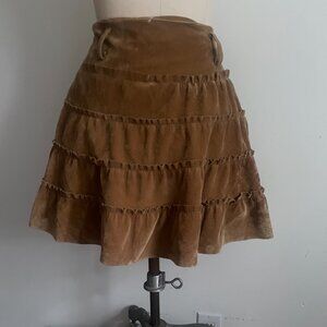 Chic and boho-inspired brown mini skirt featuring tiered ruffle seams for a soft, flowy silhouette