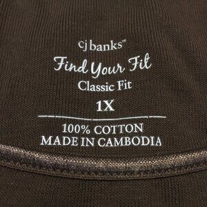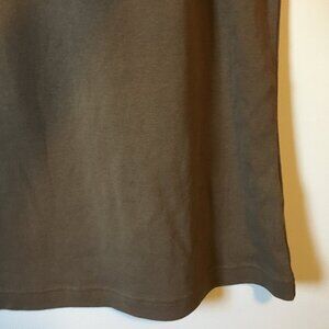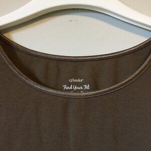 Very good preowned condition, brown (with just a hint of olive), stretchy solid tank top with a shiny trim by CJ Banks. A simple piece that is both comfortable and stylish. Easy to match and made of all natural cotton.