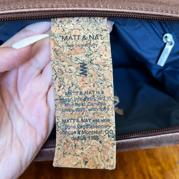 Gorgeous brown vegan lether Matt & Nat Malone doctor satchel bag, missing the crossbody strap. Lining made from 100% recycled plastic bottles.