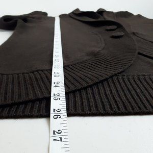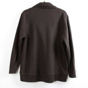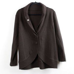 A cozy cardigan in a warm earthy brown hue. This cocoon style sweater comes with a unique double collar and hidden snap button on the inner collar. The front includes a decorative two-button closure. The hem and inner sleeves are accented with ribbed knit detail. Perfect for fall and winter. Great condition.