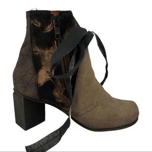 These ankle boots boast a striking leopard print design on a brown and black base, complemented by elegant ribbon-like laces. Crafted from a soft suede-like material, they feature a chunky block heel and a rounded toe, ensuring both style and comfort for everyday wear.