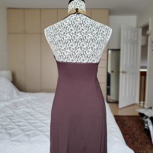 Brown dress with gold sequin halter straps. Empire cut. The fabric is stretchy.