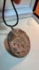 The stone is a type of jasper, specifically identified as African Map Stone or African Map Jasper. It is a form of jasper characterized by its intricate, map-like patterns and earthy colors, which can include various shades of brown, tan, and cream. The stone in the image is a large, flat, circular cabochon, which is a gemstone that has been shaped and polished. It is set with a simple wire wrap bail on a black cord.
