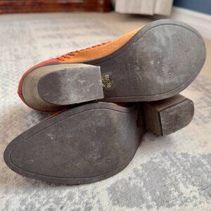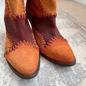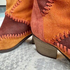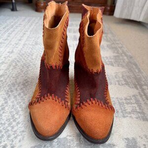 Brown and tan patchwork suede leather booties from Musse & Cloud, size 7 US/38 EU. Great used condition, cat friendly, nonsmoking home.