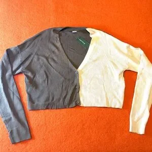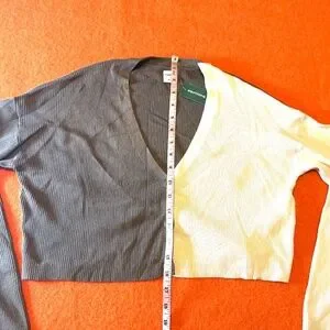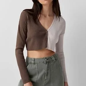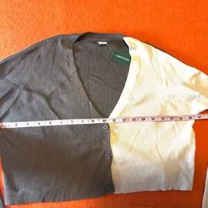 Two-tone ribbed cropped V-neck soft cardigan new with tags. Adorable colour-blocked cardigan in a soft, stretchy ribbed knit. This cropped V-neck style features long sleeves, three buttons, and a perfectly relaxed silhouette that flatters and layers beautifully. The two-tone design gives it a fun, modern twist, cute with high-waisted jeans, cargos, or a mini skirt. Made from a comfortable, high-quality 78% viscose and 22% nylon jersey, super soft, lightweight, and smooth. Colour is accurate in the stock photos, mine are taken in artificial light. Marked size L Large, please see pictures for measurements. This item comes from a smoke free, pets friendly home. Recycled bags/box used when possible. Please, let me know if you'd like any additional info. Thanks for watching!