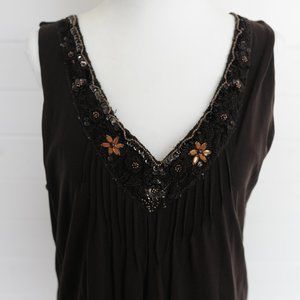 Women's brown summer camisole top, sleeveless, beadwork on front. Fitted.