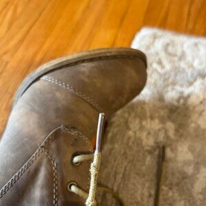 Brown fall/winter heels. Heels have light creme faux fur lining along the top. It is a block heel that is 3 inches high. These shoes have never been worn. One of the laces has some slight fraying (shown in picture 4). Overall great quality!