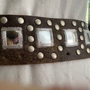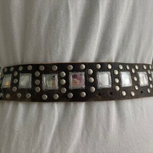 Vintage 80's Brown leather belt with studs and mirror squares. A few missing studs as seen in photo