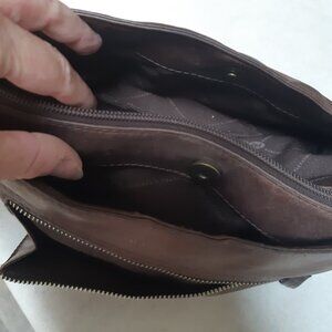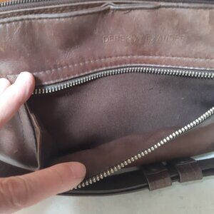 Derek Alexander brown convertible bag; Can be worn as a handbag or with a crossbody strap; Three compartments: center zippered compartment has nylon zipper, inside zippered pocket and key holder; two sections with snap closures; front metal-zippered pocket; lined in branded dark brown cloth; Double handled Brass hardware Made in Thailand 12" wide 7" high 3" deep Handle drop: 11"