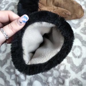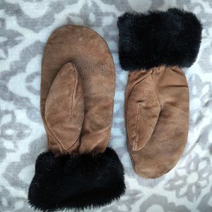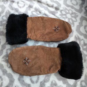 Brown suede & faux fur trimmed winter gloves fleece interior with beaded design