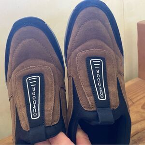These loafers feature a dark brown suede upper with black rubber overlays for added protection and style. The slip-on design includes a black elastic panel for easy wear, while the black rubber sole provides excellent traction for everyday comfort.