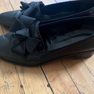 Leather almond toe loafer shoes with bow on top, made in Italy. Stylish loafers that elevate any outfit effortlessly. The soft leather is comfortable and the design is versatile, suitable for work or casual events, with skirts or pants. Small heel, 2cm or about 3/4 inch. In great condition. Worn inside the office for a few weeks, until I gave up breaking them in.