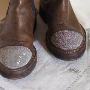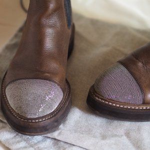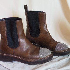 Napa leather ankle boot by Brunello Cucinelli. A modern update of the Chelsea boot, this Brunello Cucinelli boot with luxurious signature details like glittery toe and cashmere stretch insets. Easy to style, perfect for fall and winter. Keeps your feet warm on cold weather. Dark brown leather in excellent condition. Very soft, doesn't damage your feet. A touch of glitter makes it a statement piece. Made in Italy. Retail price: C$1,864